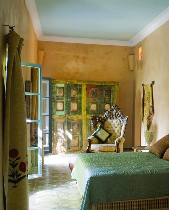 Located on the first floor, the Circassian, named after a Caucasian people, is a room full of fantasy, with pink tadelakt, intricate woodwork, multicolored windows, and textiles embroidered in a gipsy mood, the walls decorated with ancient Pakistani textiles.